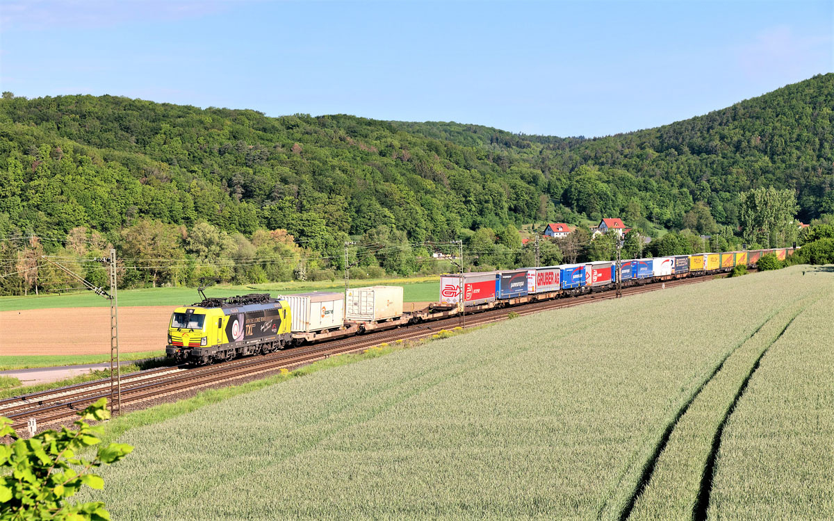 Die 193 556 ist in Gambach mit einem KLV Zug nach Süd unterwegs.Bild 18.5.2019