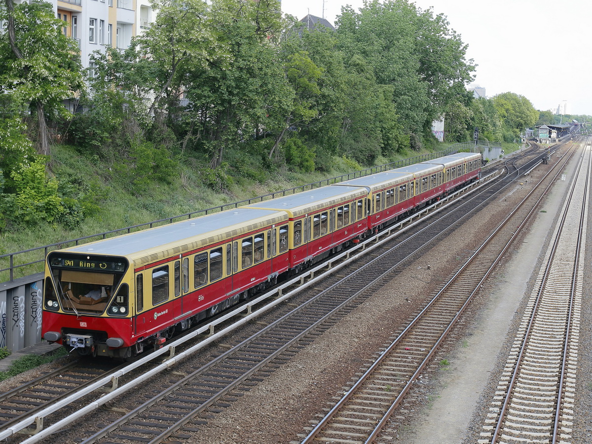 Am 19. Mai 2019 ist eine BR 480 als S 41 zwischen den Bahnhöfen Berlin-Neukölln und Berlin Herrmannstr. auf auf dem Berliner InnenRing