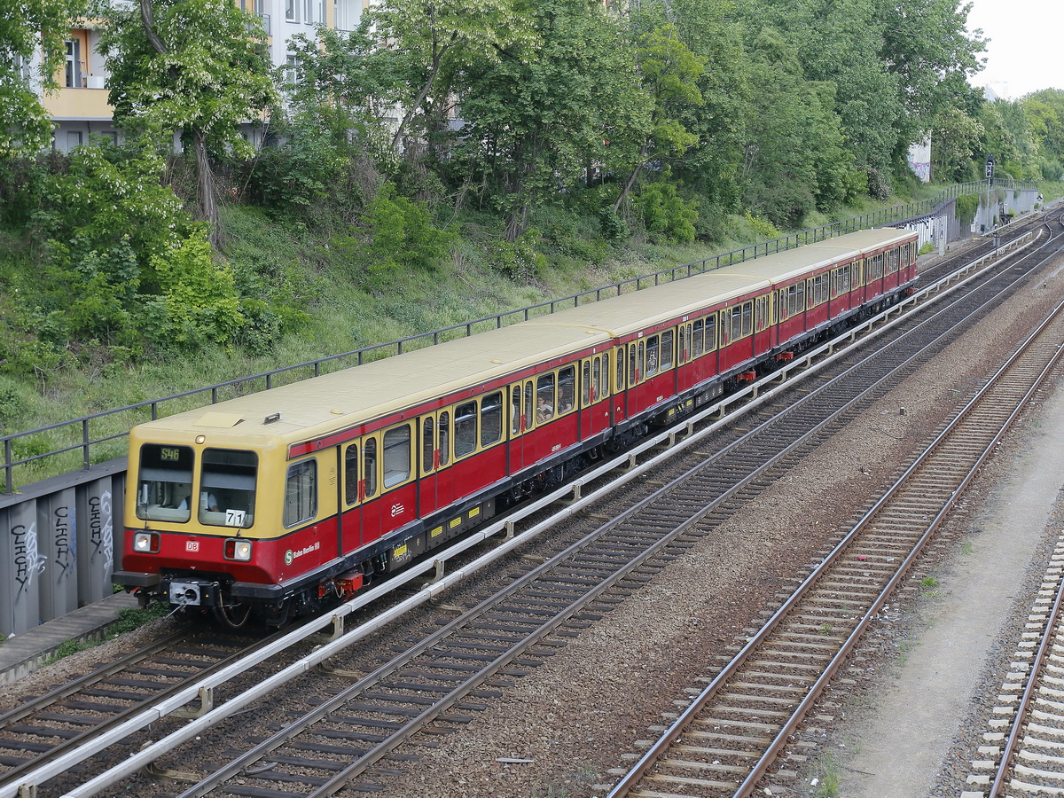 Am 19. Mai 2019 ist eine BR 485 als S 46 nach Berlin Westend zwischen den Bahnhöfen Berlin-Neukölln und Berlin Herrmannstr. auf der Strecke.