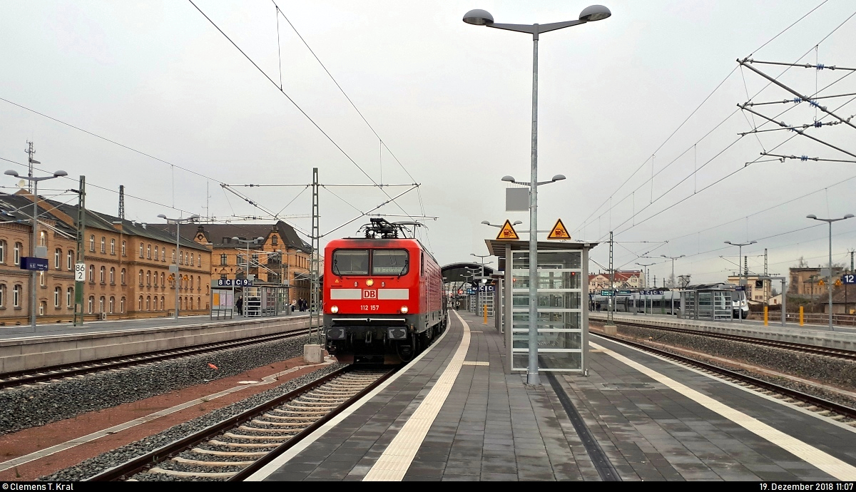 Handy-Aufnahme von 112 157 der Elbe-Saale-Bahn (DB Regio Südost) als RE 4887 (RE18) "Saale-Express" nach Jena-Göschwitz, der in seinem Startbahnhof Halle(Saale)Hbf auf Gleis 10 A-C steht. [19.12.2018 | 11:07 Uhr]