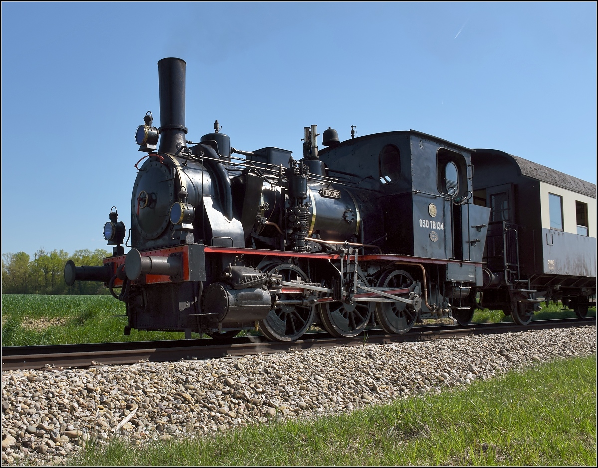 CFTR, die charmante Museumsbahn im Neubreisacher Urwald. Fahrt des Museumszuges zur Bereitstellung nach Sanssouci mit 030 TB 134 "Theodor". Baltzenheim, April 2019.