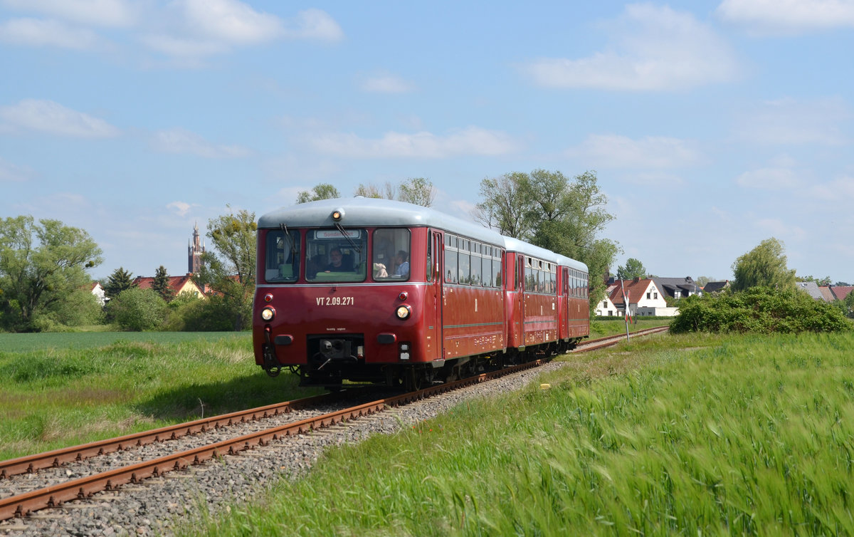 CFTR, die charmante Museumsbahn im Neubreisacher Urwald. Fahrt des Museumszuges zur Bereitstellung nach Sanssouci. Die LKM V 22 mit Orginalfabriknummer 262411 schiebt nach. Kunheim, April 2019.