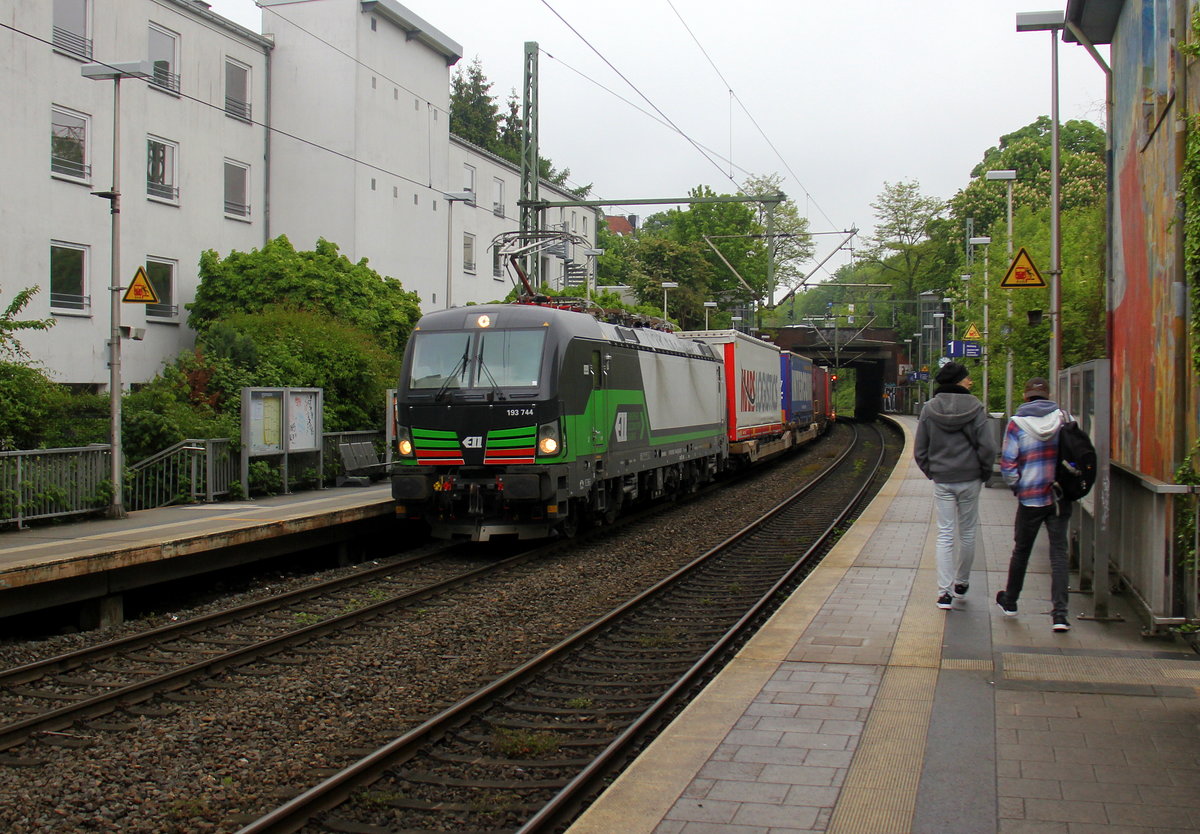 193 744 von der Wiener-Lokalbahnen-Cargo kommt aus Richtung Köln,Aachen-Hbf mit einem langen KLV-Containerzug aus Trieste-Campo-Marzio(I) nach Genk(B) und fährt durch Aachen-Schanz in Richtung Aachen-West. Aufgenommen vom Bahnsteig von Aachen-Schanz. Bei Regenwetter am Morgen vom 17.5.2019.