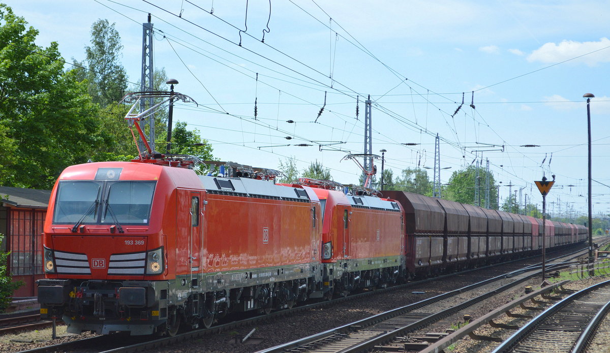 DB Cargo Deutschland AG mit der Doppeltraktion von zwei neuen Siemens Vectron Bj.2019, der  193 369  [NVR-Nummer: 91 80 6193 369-6 D-DB] +  193 372  [NVR-Nummer: 91 80 6193 372-0 D-DB] mit Erzzug aus Hamburg Richtung Ziltendorf am 23.05.19 Berlin-Hirschgarten.