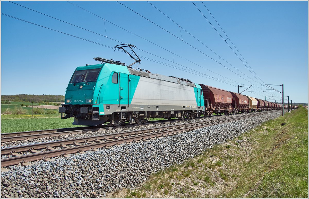 185 389-4 "CO2-frei" kommt mit einem Kohlenzug aus Norden nach Süden und fährt durch Fulda in RichtungFulda-Neudorf.