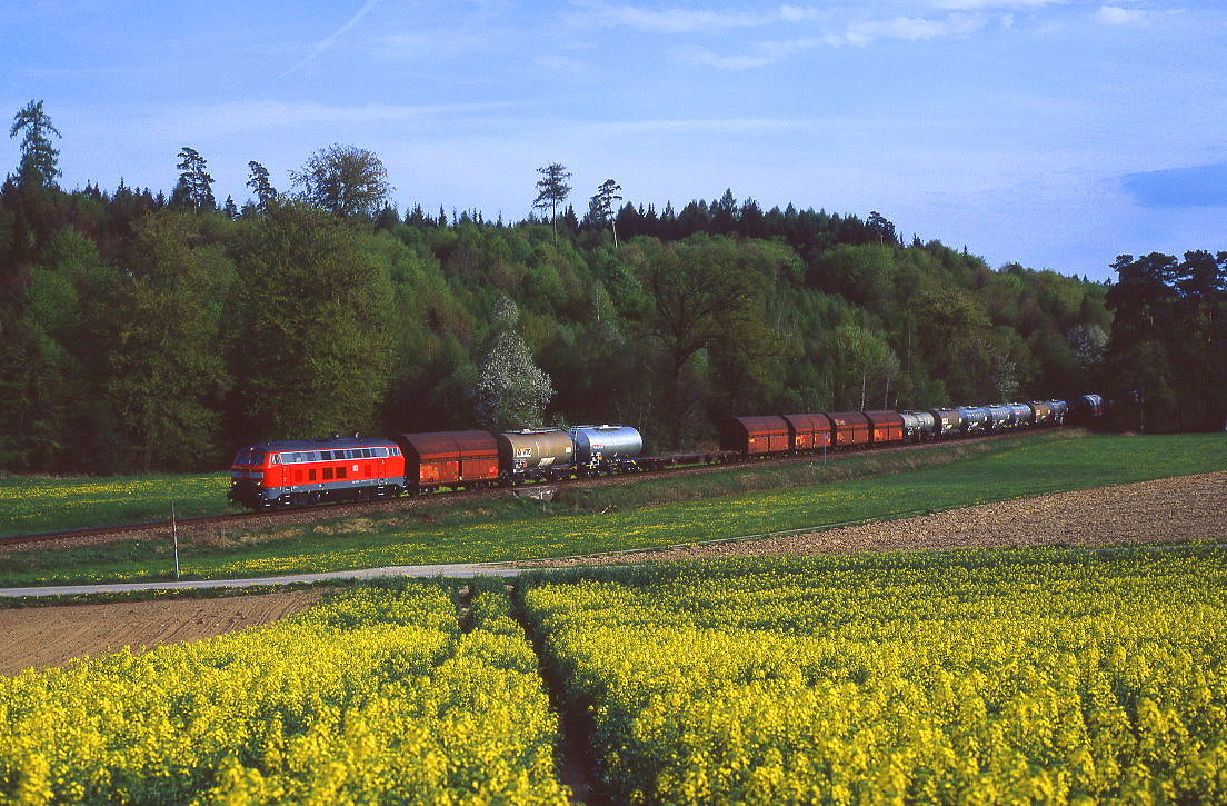185 597 mit einem Kesselzug am 25.04.2019 bei Straubing.