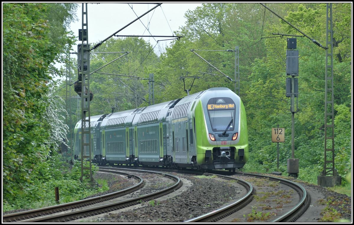 RE21061 mit 445.012 erscheint 2 Minuten später nach der Schleife auf der oberen Ebene zur Rendsburger Hochbrücke. (17.05.2019)