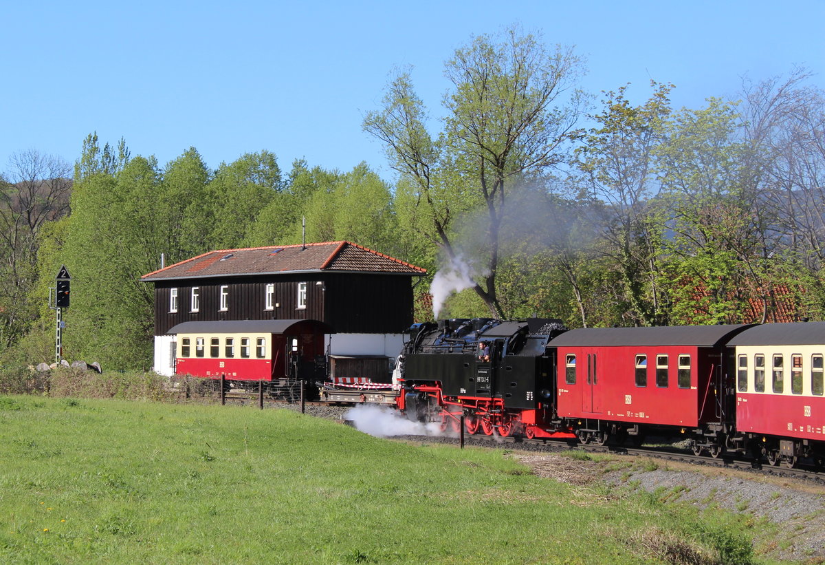 Am 25.04.19 stand ein Liebherr 922(rail), von der Erfurter Gleisbau GmbH, mit einem 2-achsigen Flachwagen der HSB auf einem Nebengleis am Bahnhof Wernigerode-Hasserode.
