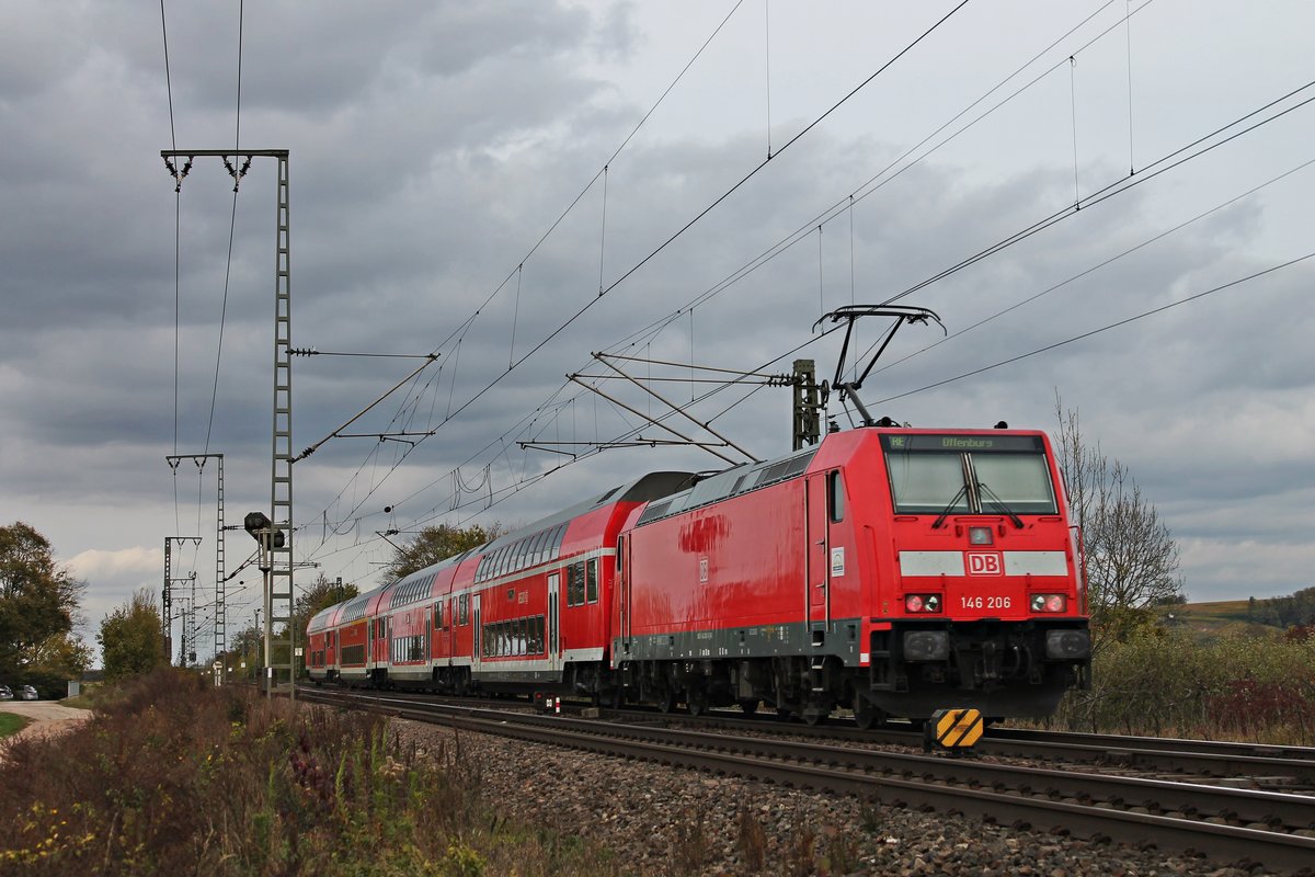 Nachschuss auf 146 206, als diese am 28.10.2017 ihren RE (Basel Bad Bf - Offenburg) bei Müllheim (Baden) in Richtung Buggingen schob.