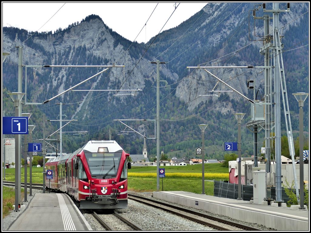 S1 1522 nach Schiers mit ABe 4/16 3105 steht abfahrbereit in Rhäzüns. (08.05.2019)