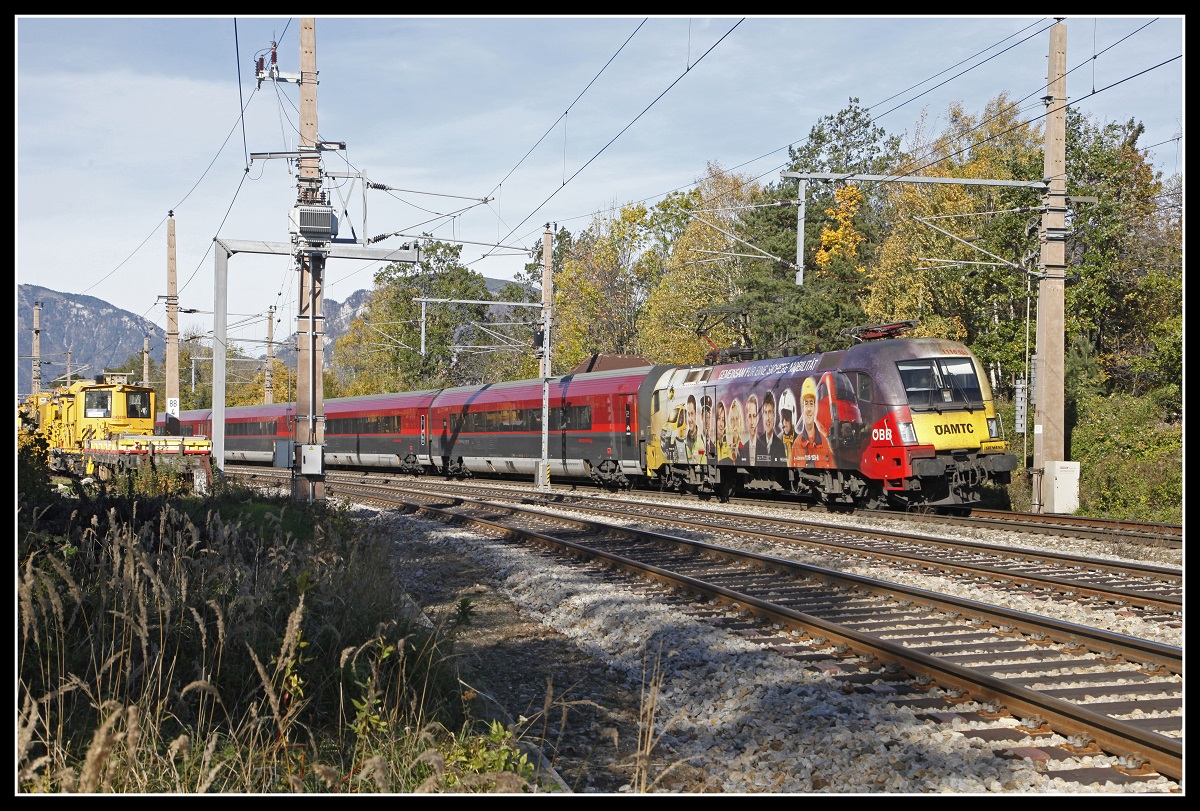 1216 237 mit Railjet in Eichberg am 24.10.2019. Als zweites Fahrzeug im Zug wird die 1216 239 kalt (ohne Leistung) mitgeschleppt.