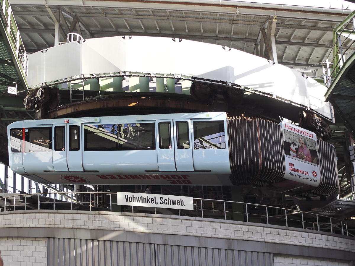 Wuppertaler Schwebebahn Typ GTW 15 Nr. 08 am 24. Oktober 2019 in der Wendeschleife Vohwinkel, gesehen von der Abstellfläche im Rahmen einer Besichtigung.