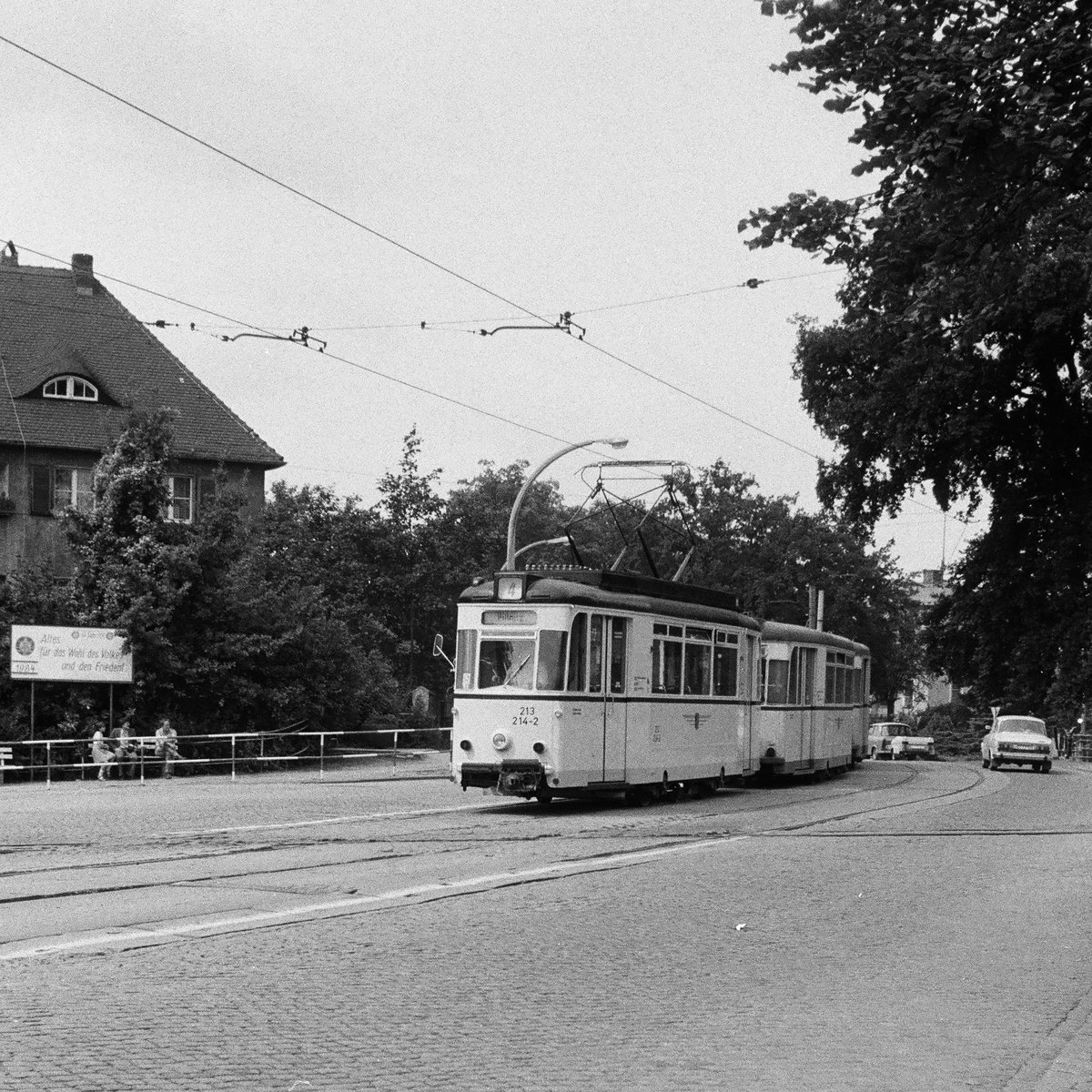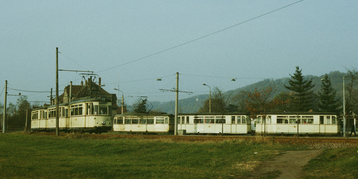 18. August 1984, Dresden, Vom 18. bis 26. August 1984 fand anläßlich des Jubiläums "100 Jahre Schmalspurbahn Radebeul - Radeburg" in Radebeul Ost eine Fahrzeugausstellung statt. Am Wochenende gab es Zubringerfahrten mit historischen Straßenbahnen vom Hauptbahnhof nach Radebeul. Tw 1660 ist gerade am Hauptbahnhof angekommen. Der 1925 in Görlitz gebaute Wagen rollte zunächst bis 1937 im Liniendienst, erlebte dann mehrere Umbauten (u.a. 1949 bis 1973 Arzt-Wagen). 1980 wurde er zum „Hauptdarsteller“ im Fernsehfilm „Meines Vaters Straßenbahn“. Bis zur Verschrottung nach 1990 gehörte er zur Flotte der historischen Wagen.