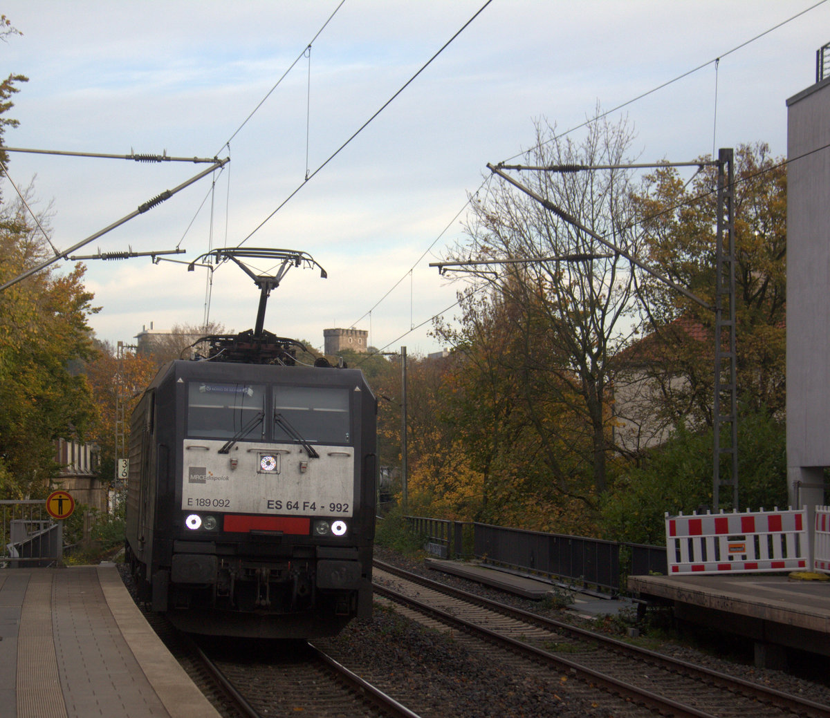 189 992-1 von MRCE kommt aus Richtung Aachen-West mit einem Containerzug aus Antwerpen-Oorderen(B) nach Gallarate(I) und fährt durch Aachen-Schanz in Richtung Aachen-Hbf,Aachen-Rothe-Erde,Stolberg-Hbf(Rheinland)Eschweiler-Hbf,Langerwehe,Düren,Merzenich,Buir,Horrem,Kerpen-Köln-Ehrenfeld,Köln-West,Köln-Süd. Aufgenommen vom Bahnsteig von Aachen-Schanz.
