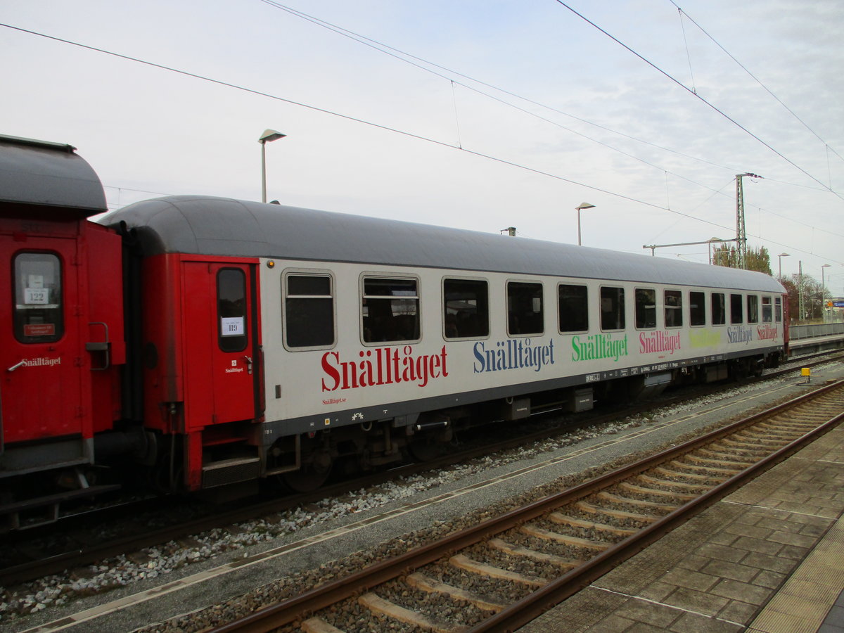 Der letzte Wagen der ausschließlich aus schwedischen Wagen gebildete Zug von Malmö nach Berlin am 08.November 2019 in Bergen/Rügen.Der Wagenpark fuhr am 11.November 2019 wieder zurück nach Schweden.
