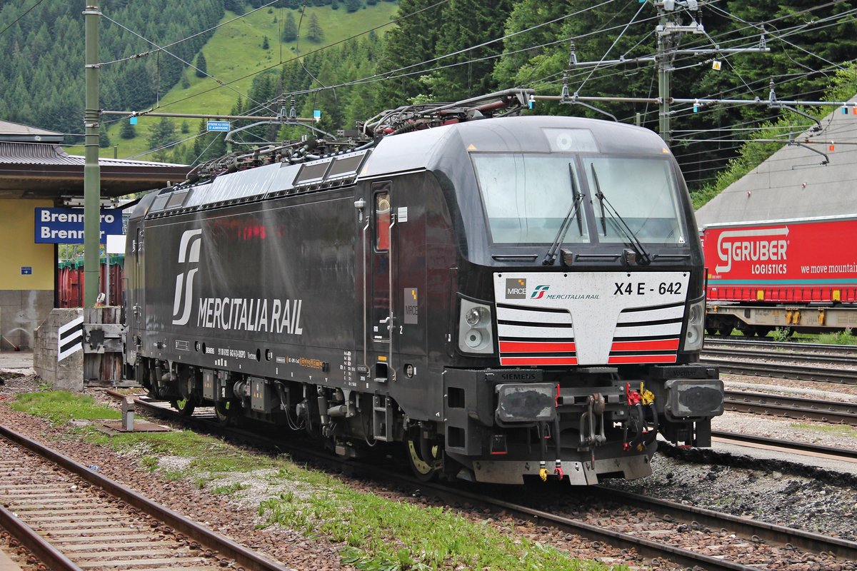 Portrait von MRCE/MIR X4 E-642 (193 642-6) "MERCITALIA RAIL" am Mittag des 05.07.2018, als diese auf einem Abstellgleis im Bahnhof von Brennero abgestellt stand und auf ihren nächsten Einsatz wartete. Zuvor brachte sie mit einem weiteren Vectron einen Containerzug in den Grenzbahnhof zu Österreich.