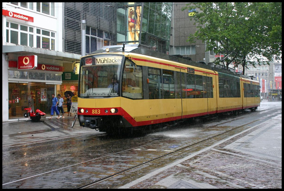 Am 7.7.2006 hat die Tram 883 als S 5 nach Mühlacker freie Fahrt in der Karlsruher Fußgängerzone. Ein plötzlicher Starkregen hat alle Passanten von der Straße verjagt!