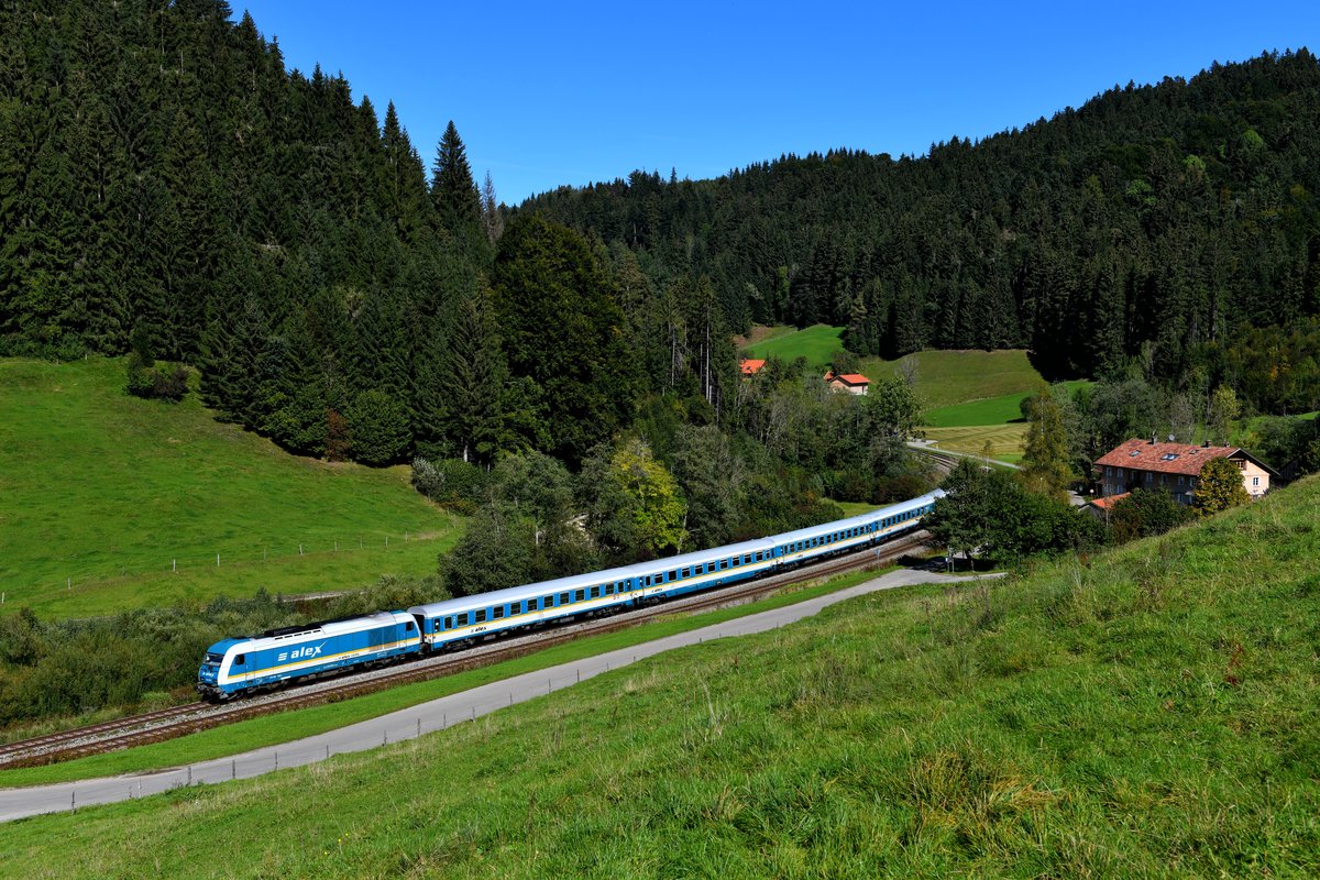 Oft gezeigt und doch immer wieder schön: Die S-Kurve bei Heimhofen. Einen Vorteil haben die konstanten Zugausfälle der Alex Züge zwischen Immenstadt und Oberstdorf. Die Züge nach Lindau bestehen aufgrund der unterbleibenden Zugteilung aus sechs Wagen. Ettliche Motive rund um Oberstaufen wirken mit längeren Zügen einfach harmonischer. Am 29. September 2019 nutzte ich die Gelegenheit und fotografierte die von Beacon Rail angemietete ER 20 - 015 mit ihrem ALX 84106 auf der Fahrt zum Bodensee.
