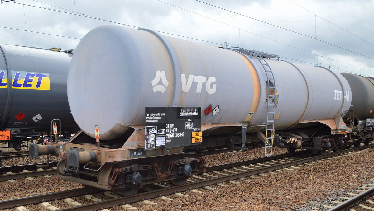Kesselwagen vom Einsteller VTG mit der 33 RIV 80 D-VTG 7848 268-8 Zans Befüllung: (UN-Nr.. 30/1863 = Düsenkraftstoff, Dampfdruck bei 50 °C größer als 110 kPa) Kesselaufschrift: JET-A1 in einem Ganzzug am 30.09.19 Bf. Flughafen Berlin Schönefeld.