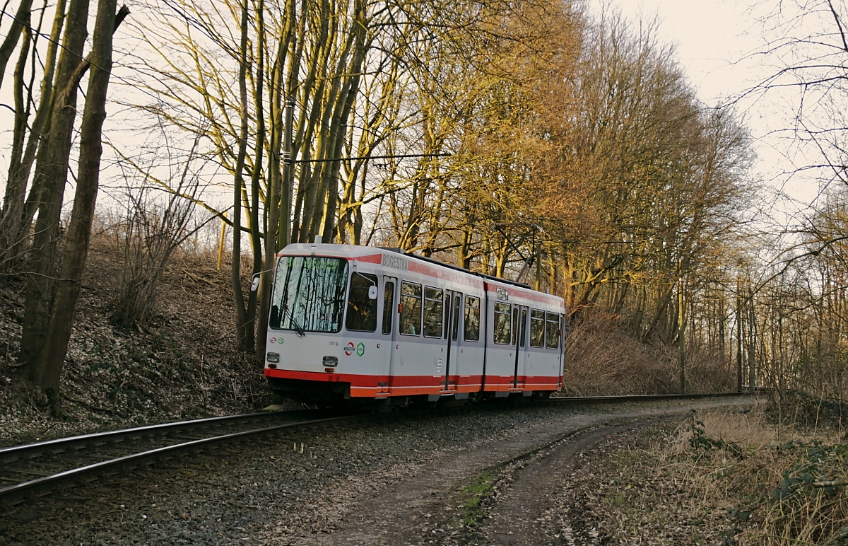 Ab dem 15.12.2019 werden in Bochum nur noch Niederflurfahrzeuge eingesetzt, damit endet auch der Einsatz der hochflurigen M6S. Da die neue Stadtbahnstrecke zwischen Bochum-Langendreer und Witten-Crengeldanz erst im kommenden Jahr fertiggestellt ist, werden die Bahnen der Linie 310 auf diesem Teilstück durch Busse ersetzt. Damit wird auch der eingleisige Streckenabschnitt zwischen der Unterstraße in Langendreer und Crengeldanz nicht mehr bedient, er wird nur noch für Betriebsfahrten benötigt. Am 11.03.2015 ist der M6S auf der Universitätsstraße in Richtung Witten unterwegs. Das Foto entstand vom Haltestellenende aus.