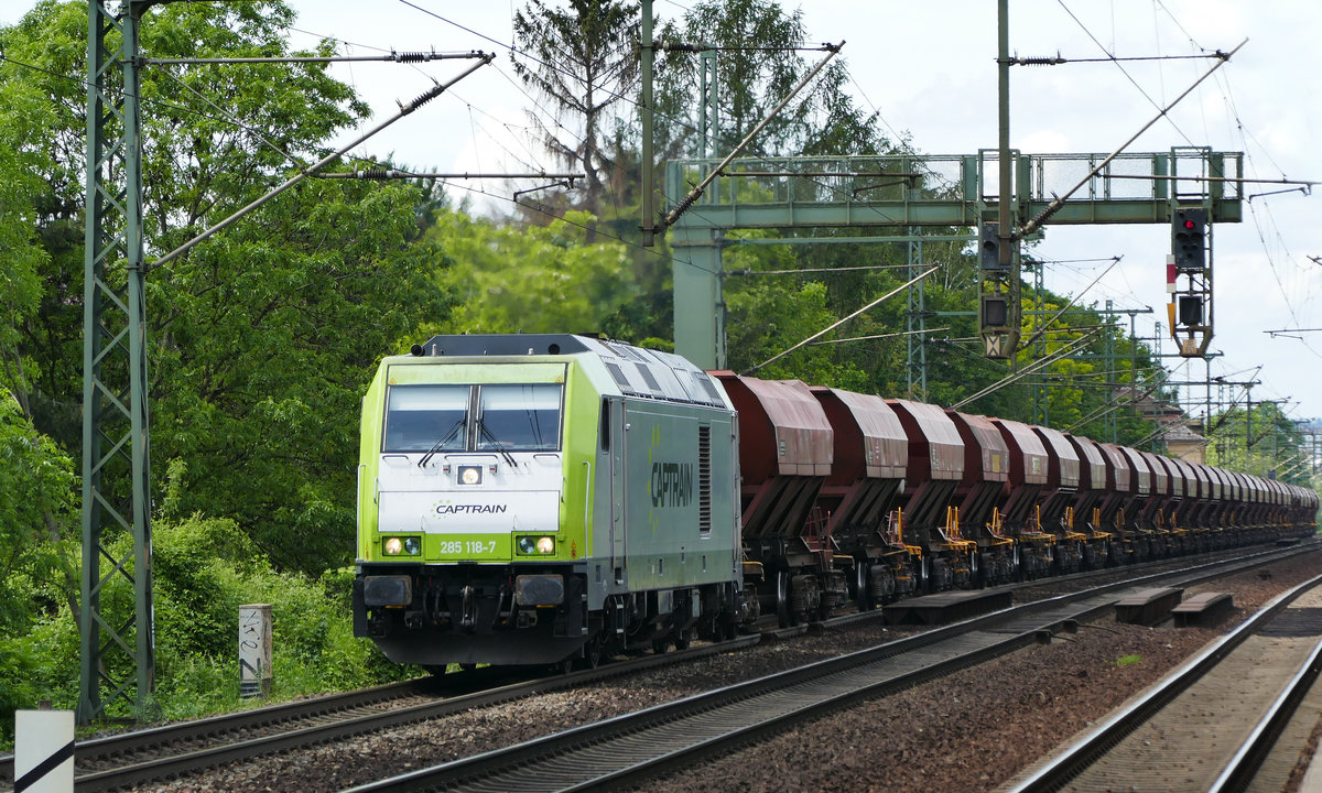 21. Mai 2019, Ein Schüttgut-Ganzzug mit Lok 285 118 der ITL fährt durch den Haltepunkt Dresden-Strehlen in Richtung Pirna.