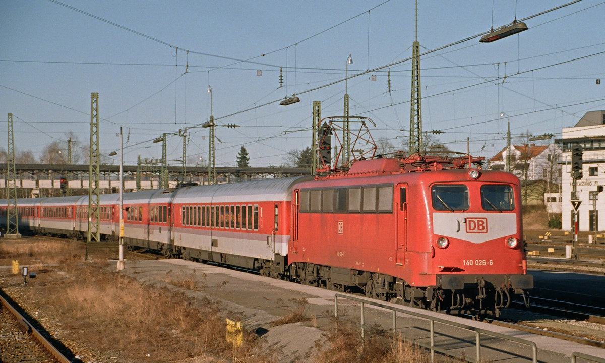 15. Februar 1998, Bahnhof Freilassing, Lok 140 026-6 fährt mit Wagen des IC724 von Berchtesgaden ein.