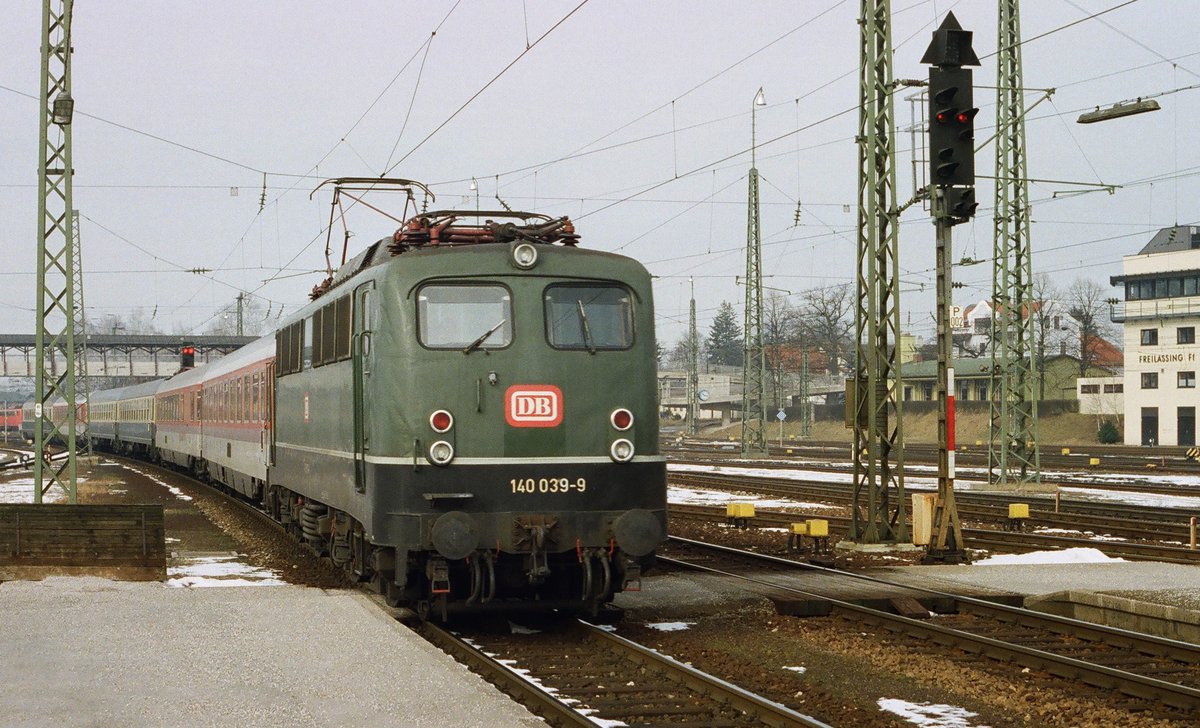 20. Februar 1994, Lok 140 039-9 fährt mit einem D-Zug aus München in den Bahnhof Freilassing ein.