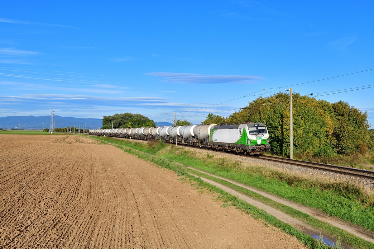 Salzburger Eisenbahn Transport Logistik GmbH, Salzburg [A] mit der ELL Vectron  193 821  [NVR-Nummer: 91 80 6193 821-6 D-ELOC] und einem Ganzzug Knickkesselwagen (Kreideschlamm) nach Personalwechsel Bf. Flughafen Berlin Schönefeld, 17.10.19 Ausfahrt.