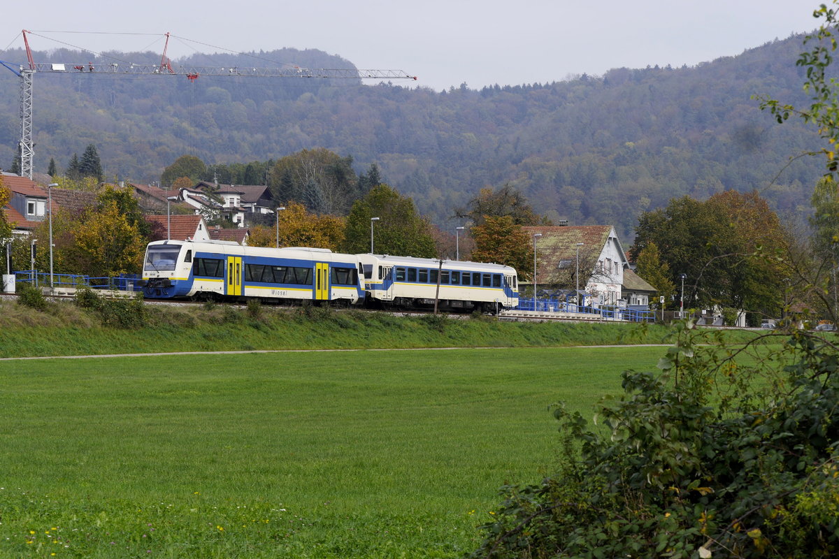 Nur auf der Wieslauftalbahn zu sehen: Steuerwagen 926 426 mit RegioShuttle 650 689 (VT 441) kurz vor der Endstation Rudersberg-Oberndorf (22.10.19).