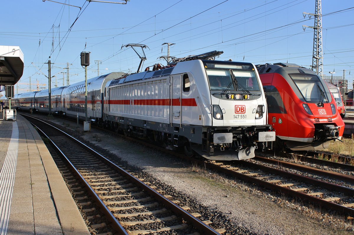 Für eine Testfahrt verlässt dieser InterCity gezogen von 147 551 am 15.11.2018 den Nürnberger Hauptbahnhof in Richtung Norden.