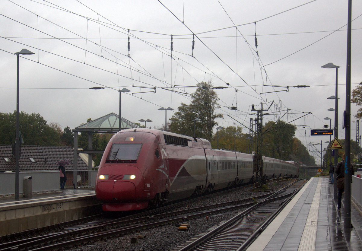 Der Thalys aus Köln-Hbf(D) nach Paris(F) kommt durch Kohlscheid als Umleiter aus Richtung Rheydt,Herzogenrath und fährt in Richtung Aachen-West,Aachen-Schanz,Aachen-Hbf und fährt die Kohlscheider-Rampe hoch. Aufgenommen von Bahnsteig 1 in Kohlscheid. Bei Regenwetter am Nachmittag vom 15.10.2019.