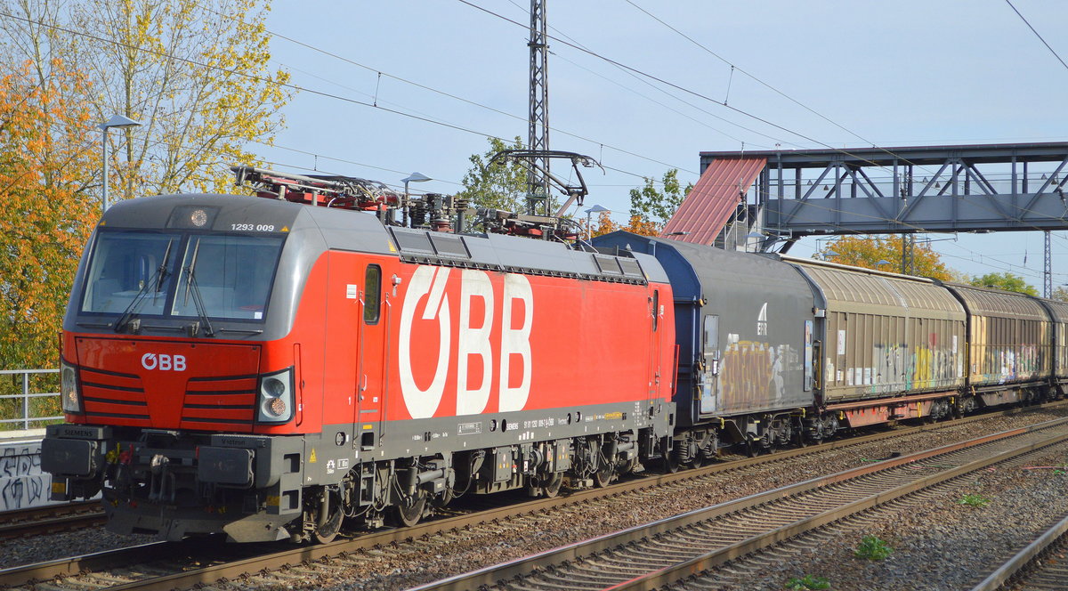 ÖBB-Produktion GmbH, Wien [A] mit der Vectron  1293 009  [NVR-Nummer: 91 81 1293 009-7 A-ÖBB] und gemischtem Güterzug am 22.10.19 Durchfahrt Bf. Saarmund.