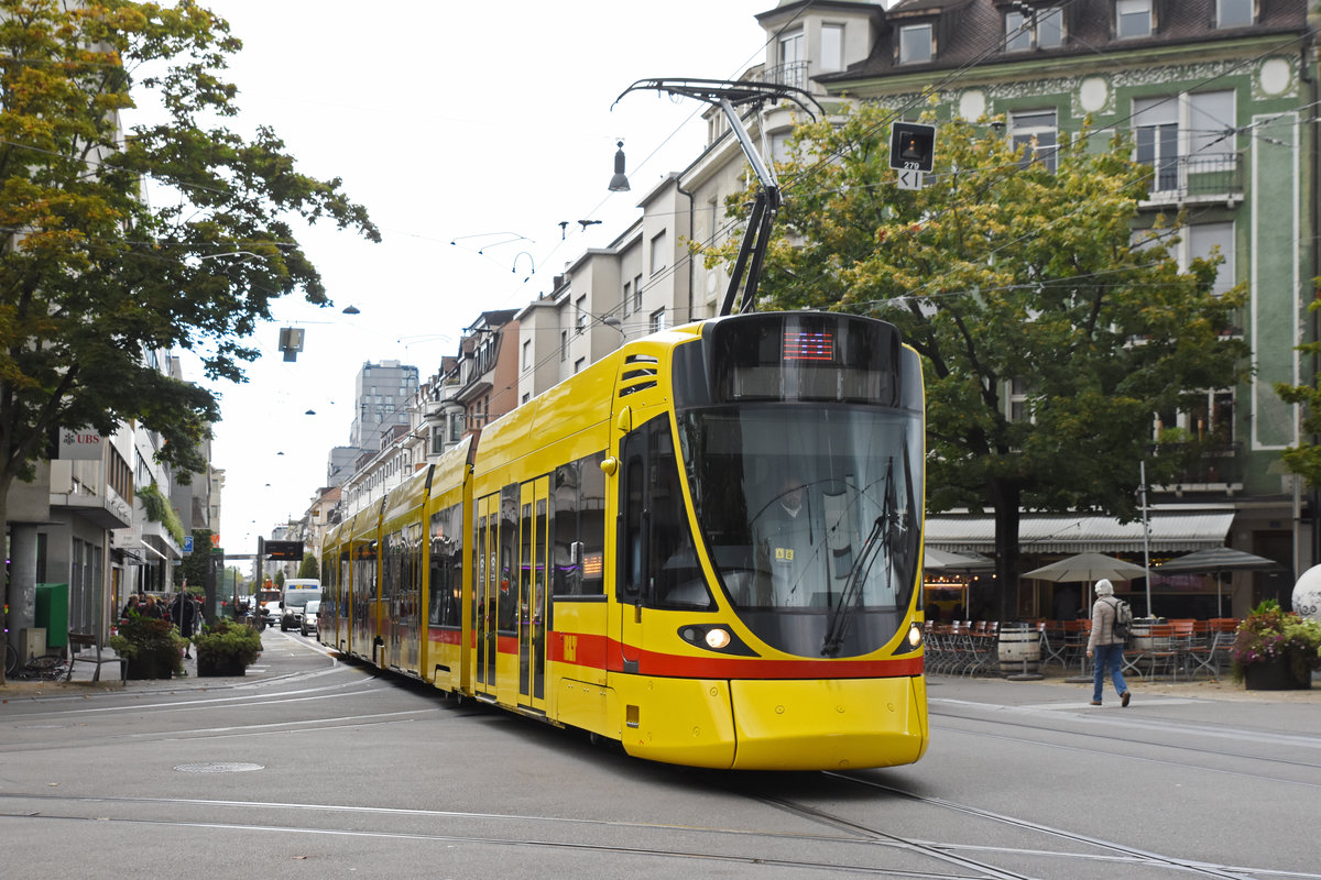 Während der Grossbaustelle am Bankverein, werden fast alle Linien umgeleitet oder verlängert. Am 07.10.2019 fährt der Be 6/8 Flexity 5025, auf der Linie 15, bei der Haltestelle Grosspeterstrasse ein.