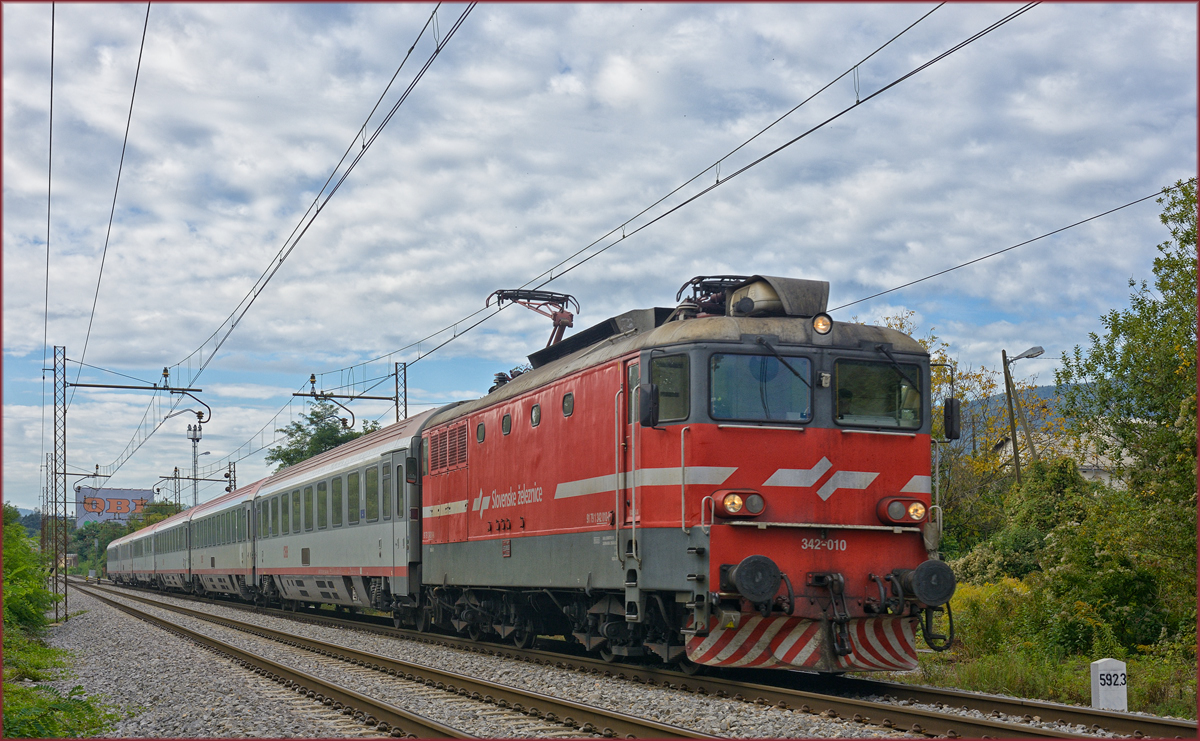 SŽ 342-010 zieht EC158 Croatia durch Maribor-Tabor Richtung Wien. /25.9.2019