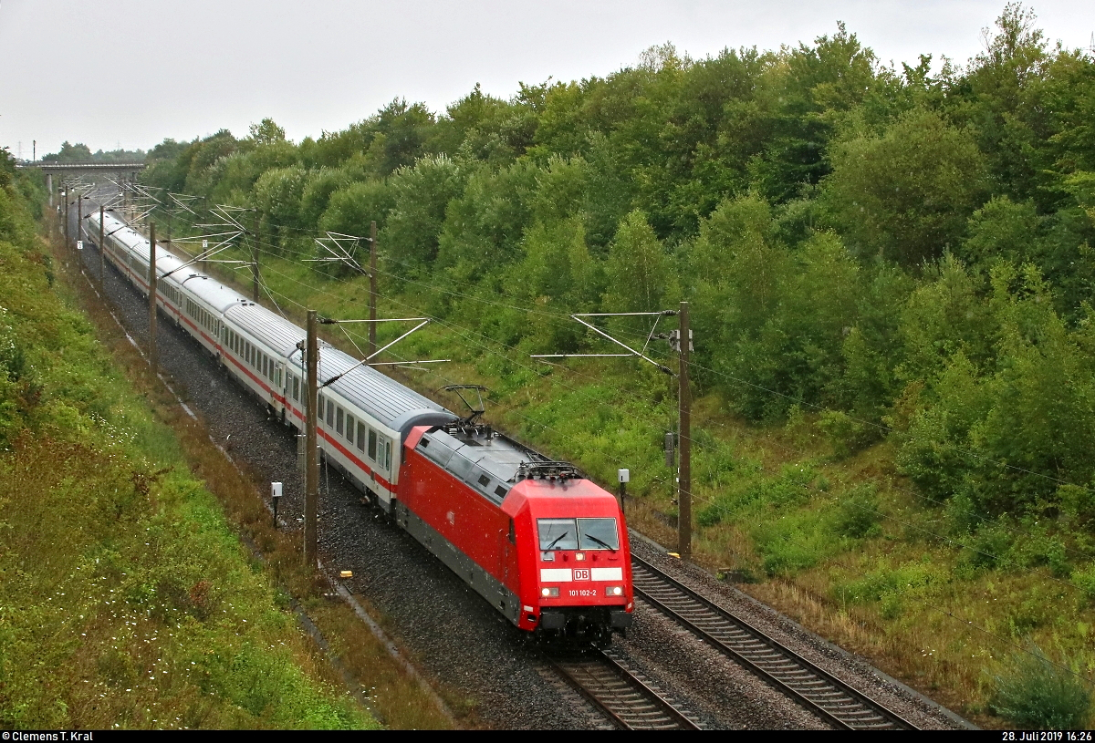 101 053-7 als IC 2292 (Linie 62) von Stuttgart Hbf nach Frankfurt(Main)Hbf fährt im strömenden Regen bei Markgröningen bzw. Schwieberdingen auf der Schnellfahrstrecke Mannheim–Stuttgart (KBS 770). Aufgenommen von einer Brücke. [28.7.2019 | 16:23 Uhr]