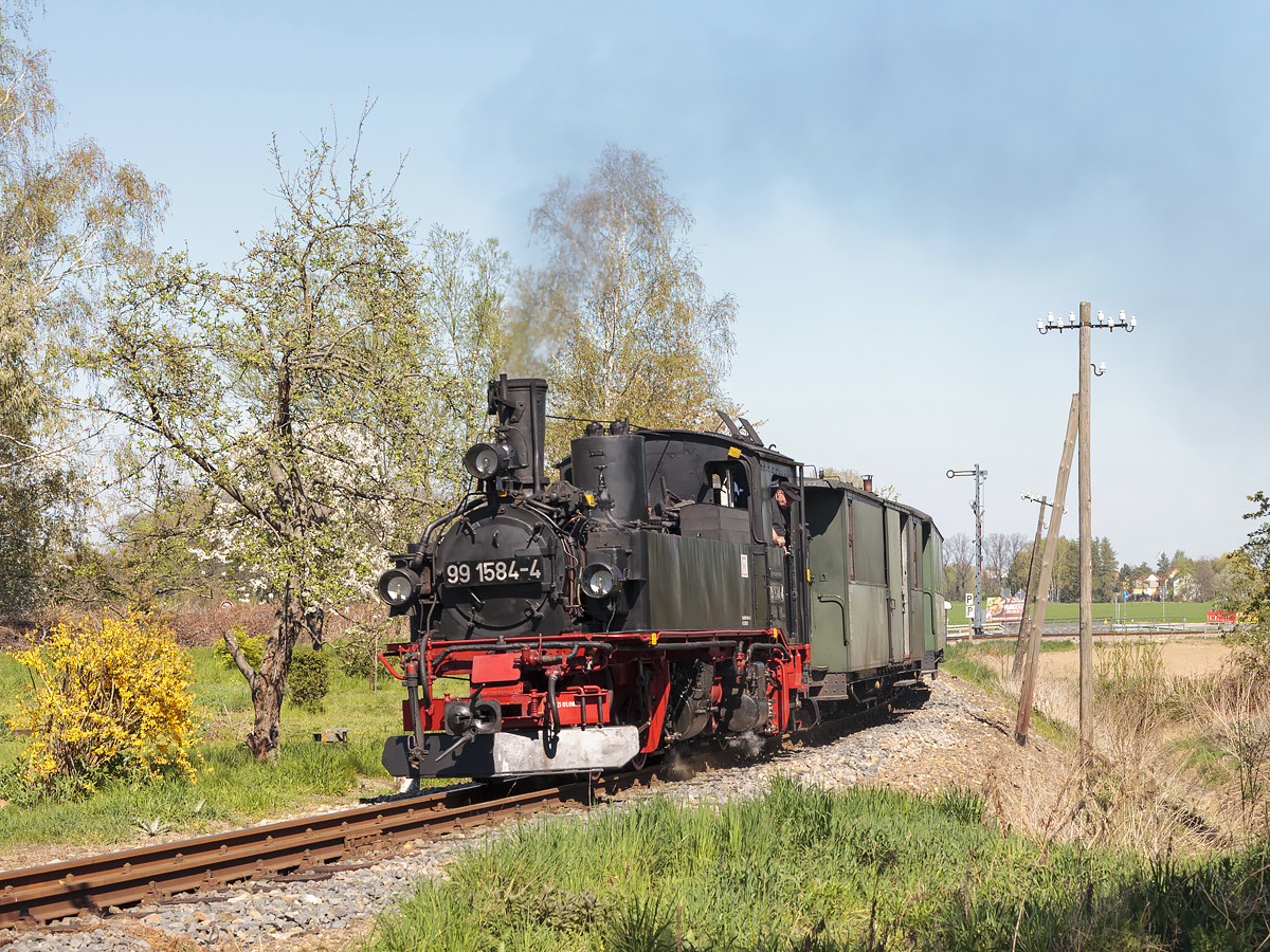Die Lok Nr.20 mit Osterzug zwischen Bahnhöfe Hettstedt Kupferkammerhütte Pbf und Siersleben am 20. April 2019.