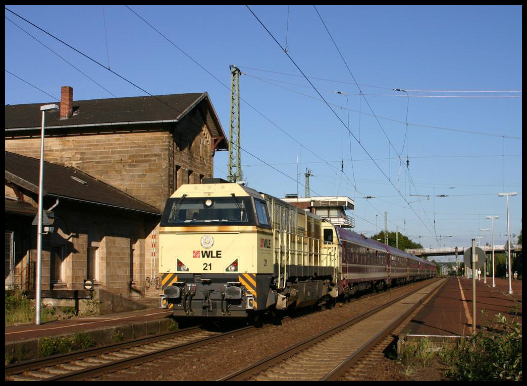 Die WLE 21 Warsteiner Werbelok kommt hier am 18.9.2005 mit einem Müller Partyzug in Richtung Münster durch den Bahnhof Hasbergen. Zu diesem Zeitpunkt ist das Stellwerk in Hasbergen noch besetzt und wird nicht, wie heute, von Osnabrück aus ferngesteuert! Auch hat das Gebäude noch die schräge elegante Fensterfront, die wenig später gegen senkrecht stehende Fenster getauscht wurde.
