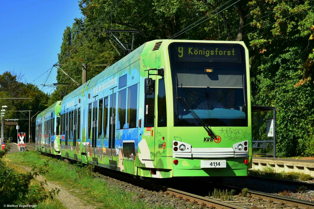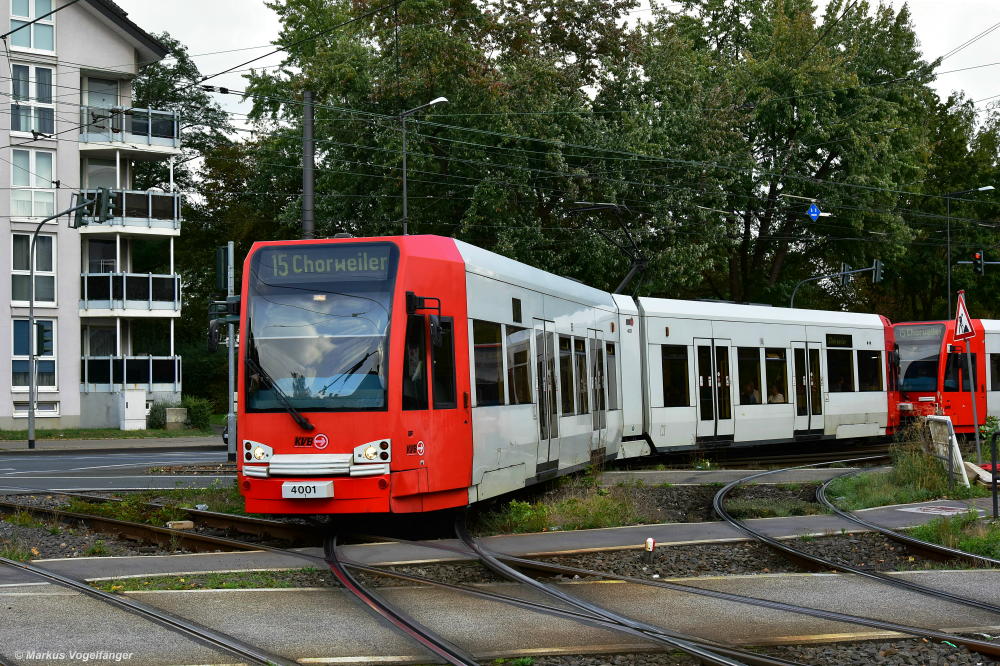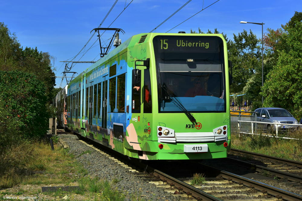 Die beiden für das KVB-Rad werbenden Niederflurwagen 4041 und 4064 auf der Neusser Straße am 21.09.2019.
