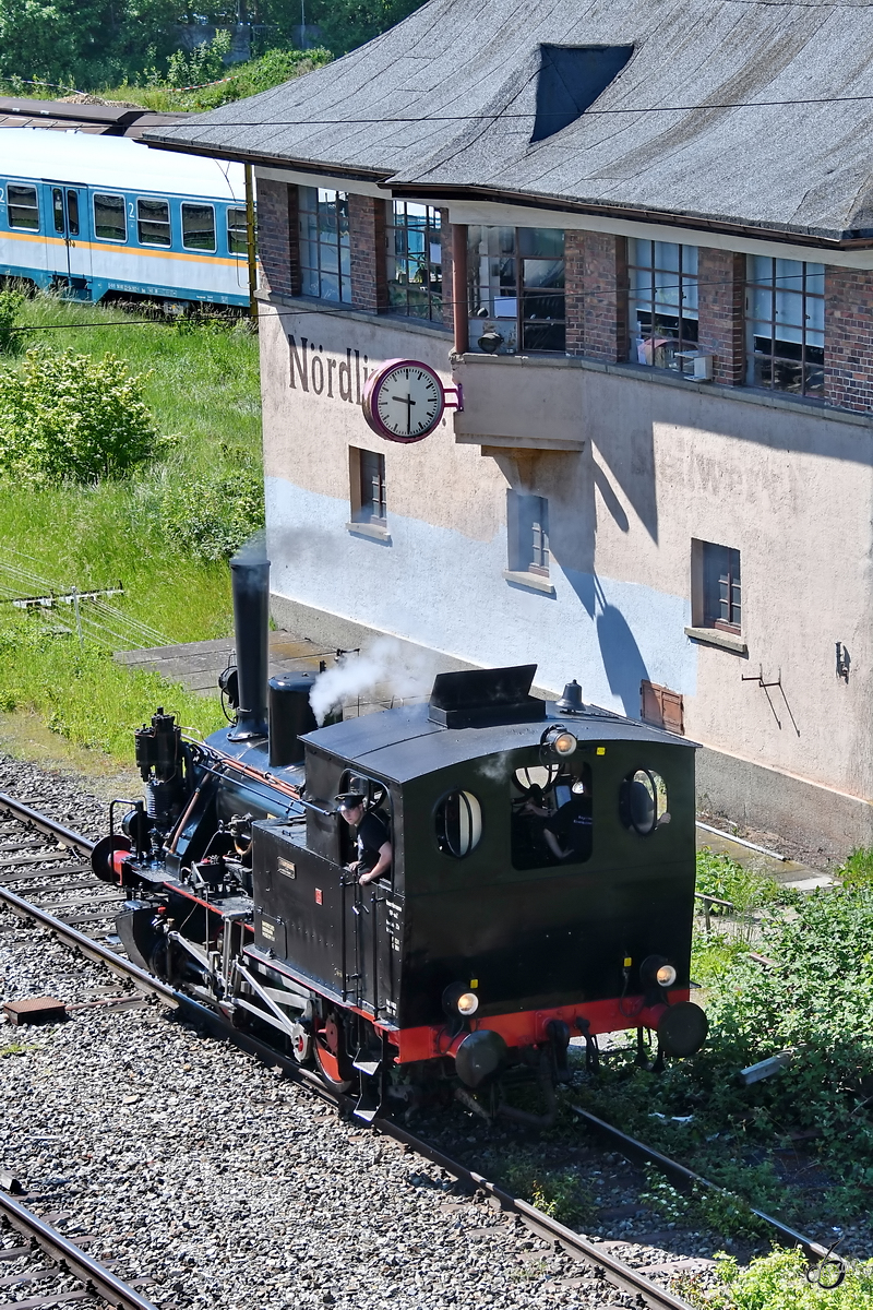 Die 1929 bei Krauss gebaute Dampflokomotive 2 "Grüner Heiner" war Anfang Juni 2019 etwas Abseits im Bayerischen Eisenbahnmuseum Nördlingen abgestellt.