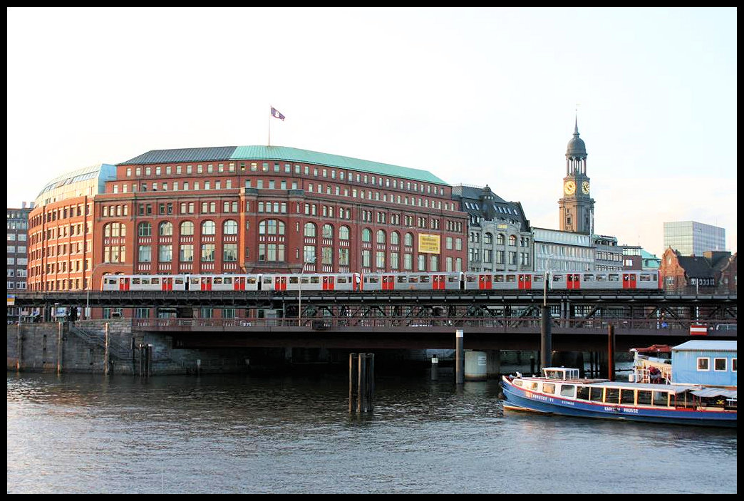 Oberhalb der Binnenhafenbrücke in Hamburg verlässt hier am 26.11.2005 ein U-Bahn Zug der Rheihe DT 2 den Bahnhof Baumwall.
