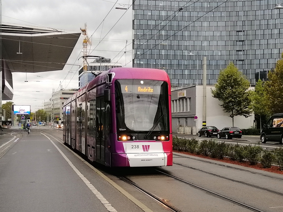 Graz. Am 28.09.2019 fuhr Variobahn 238 auf der Linie