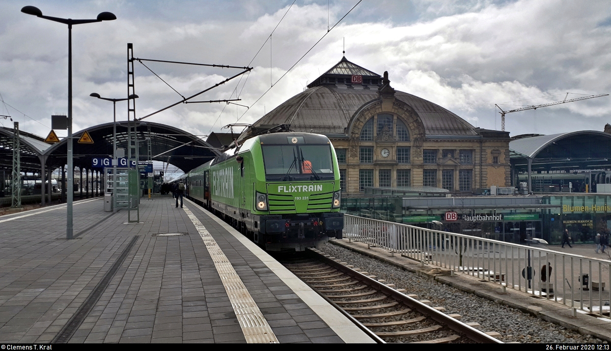 193 721-8 (Siemens Vectron) der ELL Austria GmbH (European Locomotive Leasing), vermietet an die Salzburger Eisenbahn Transportlogistik GmbH (SETG), im Einsatz für die Flixtrain GmbH (Flixmobility GmbH), als FLX76307 (FLX 10) von Berlin Hbf (tief) nach Stuttgart Hbf, mit Umleitung über Mannheim Hbf und Heidelberg Hbf, erreicht Halle(Saale)Hbf auf Gleis 6 bei Regenwetter. (Smartphone-Aufnahme) [10.3.2020 | 16:23 Uhr]