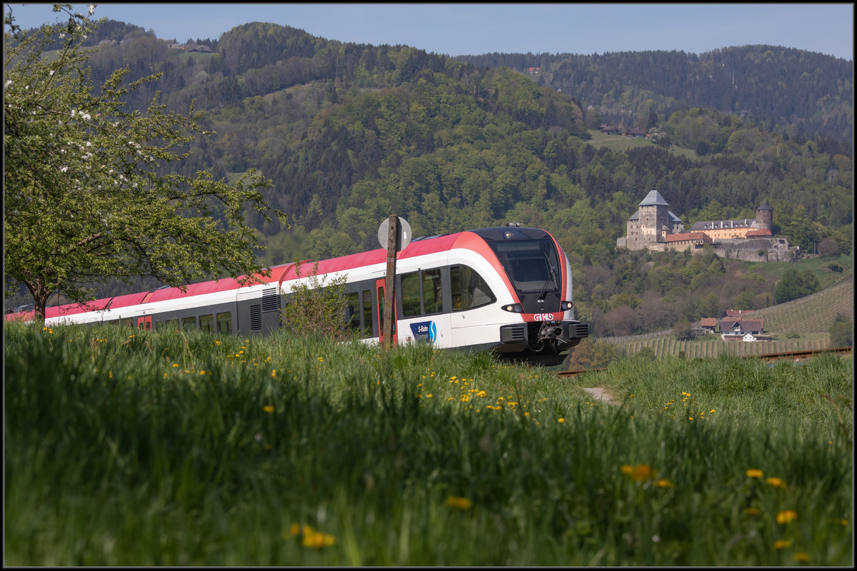S12 Thurbo GTW nach Sargans bei Haldenstein. Aufnahme vom Satz herunter 330m über dem Rhein und einiges über der einzigen Windturbine im Churer Rheintal.(16.04.2020)