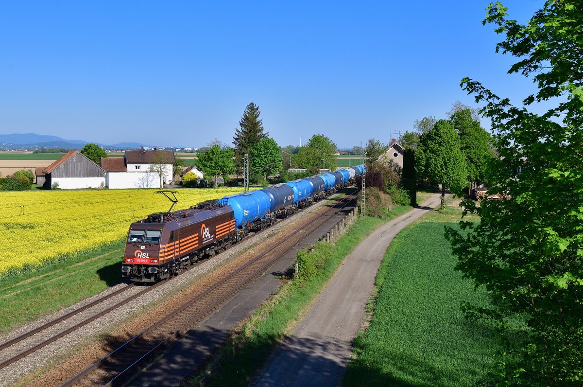 Durchfahrt am Nachmittag des 25.05.2019 von Re 482 016-3 mit einem leeren Kesselzug aus Glattbrugg (CH) durch den Haltepunkt von Auggen im Markgräflerland in Richtung Freiburg (Breisgau).