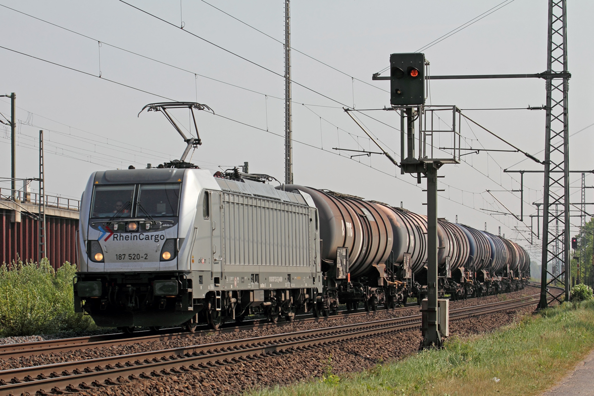 187 323 mit einem Containerzug am 21.04.2020 bei Langenisarhofen.