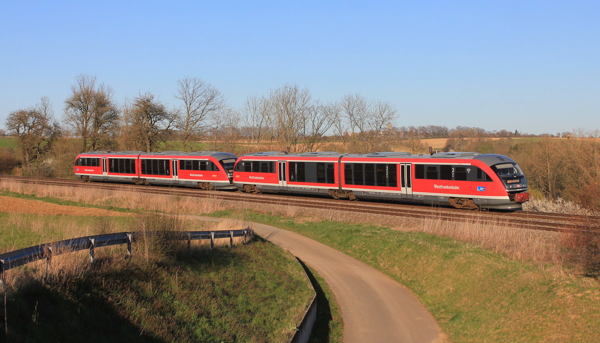 Am 4.5.16 begegneten sich in Mellrichstadt der VT 022 als RB nach Schweinfurt auf Gleis 2 und der VT 007 als RB nach Meiningen auf Gleis 3.