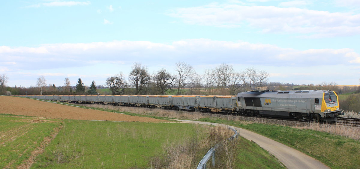 Vom temporären Fotostandpunkt (dessen Schatten leicht erkennbar ist) in Weinstadt-Endersbach an der S-Bahnstation 'Stetten - Beinstein' bietet sich dieser Blick auf die Remsbahn mit dem Kappelberg und dem Ort Rommelshausen im Hintergrund.