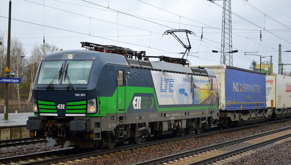 LTE Logistik- und Transport GmbH, Graz [A] mit der ELL Vectron "193 261" [NVR-Nummer: 91 80 6193 261-5 D-ELOC] und Taschenwagenzug aus Poznan (Polen) Richtung Rotterdam am 10.03.20 Durchfahrt Bf. Flughafen Berlin Schönefeld.