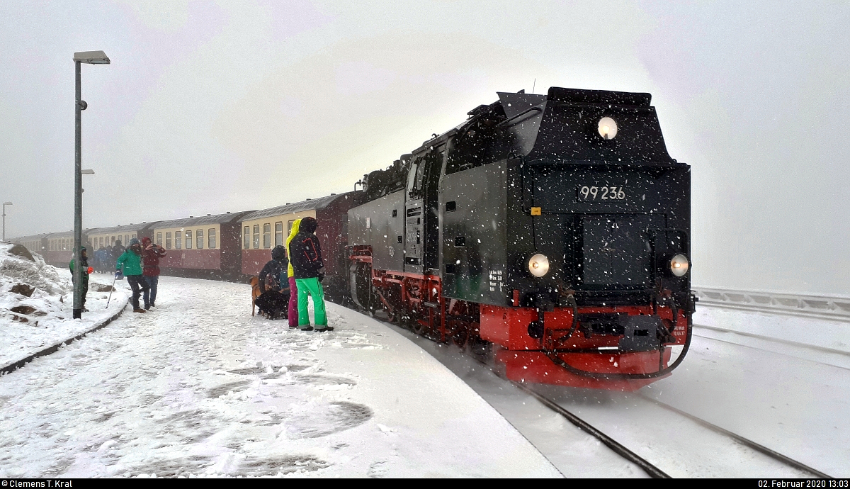 Portrait von 99 7236-5 (99 236) der Harzer Schmalspurbahnen GmbH (HSB) als P 8930 nach Wernigerode Hbf, der bei Schneetreiben im Startbahnhof Brocken auf der Brockenbahn (Bahnstrecke Drei Annen Hohne–Brocken | KBS 325) steht.