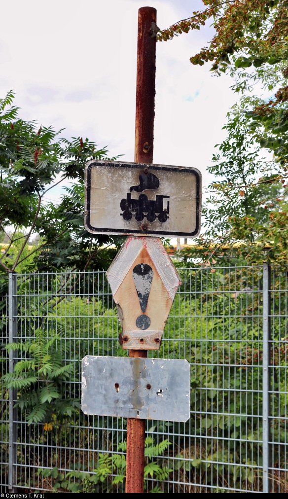 Dieses nur noch in Teilen erhaltene Schild vor dem WDI Werk Rothenburg (Westfälische Drahtindustrie) warnt vor fahrenden Zügen auf dessen Gelände. In der Tat besitzt das Werk bis heute einen Gleisanschluss über die Bahnstrecke Könnern–Rothenburg (6909), nur mit Diesel- statt mit Dampflokomotiven. ;)